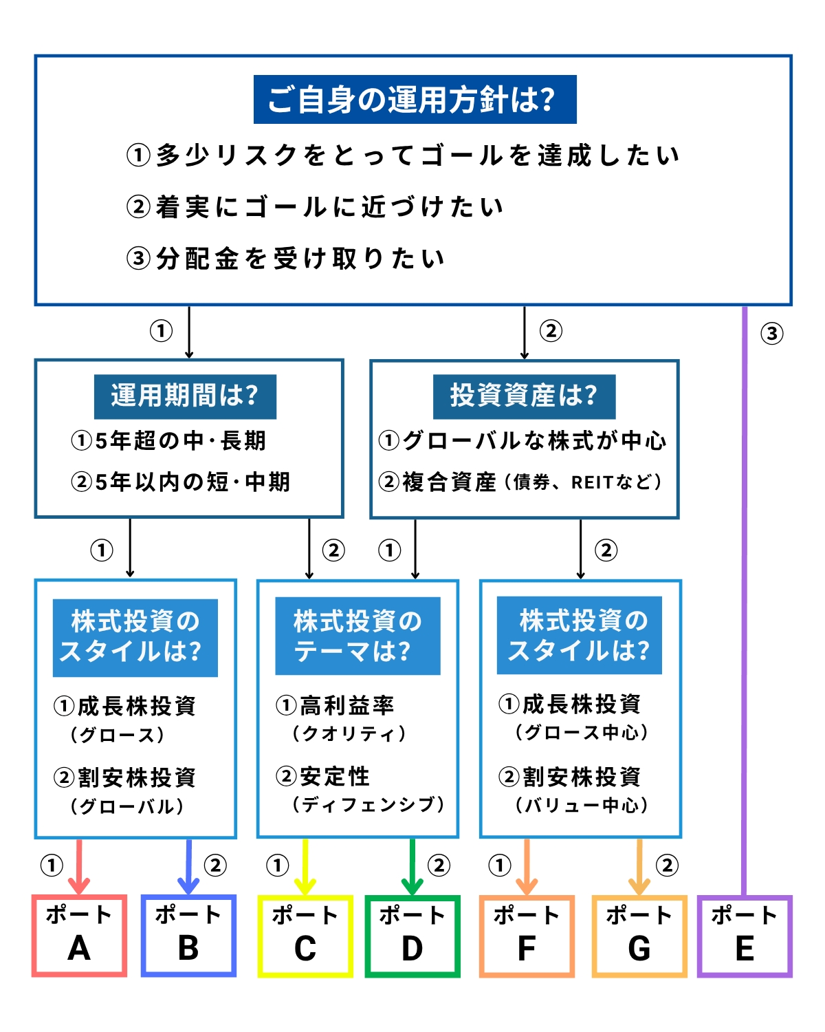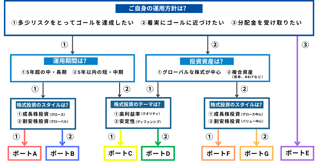世界の割安株を中心に据えつつ、債券や不動産、金などを組み入れて構築するポートフォリオです。異なる資産クラスを組み合わせることでリスク分散を目指します。 |